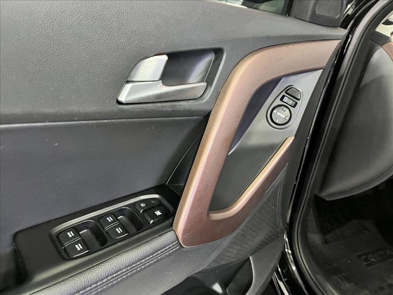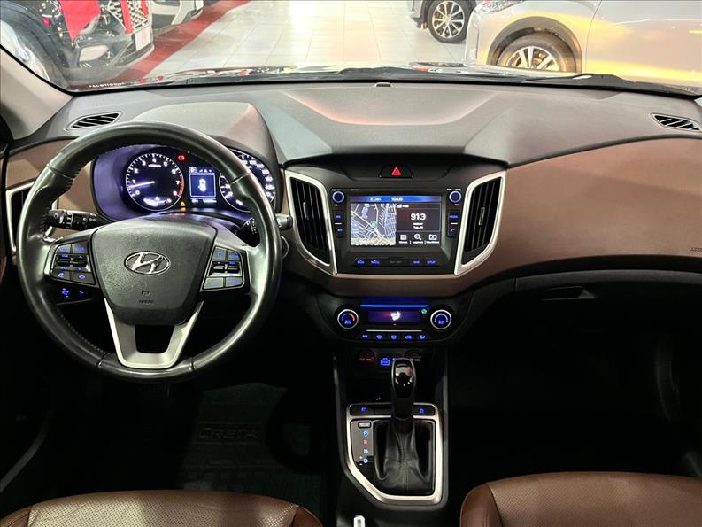 O Hyundai Creta Prestige 2017, topo de linha, traz motor 2.0 Flex de 166 cv (E) / 156 cv (G) com câmbio automático de 6 marchas, tração dianteira, direção elétrica, e se destaca pelo pacote completo: 6 airbags, ar-condicionado digital, bancos de couro, central multimÃdia com tela de 7", GPS, câmera de ré, sensores de estacionamento, e itens de conforto como partida por botão, chave presencial e banco do motorista com ventilação. É um SUV bem equipado, focado em segurança e tecnologia para o segmento. Motor e Performance Motor: 2.0L Gamma Flex VVT. Potência: 166 cv (Etanol) / 156 cv (Gasolina). Torque: 20,5 kgfm (E) / 19,1 kgfm (G). Câmbio: Automático sequencial de 6 velocidades. Tração: Dianteira. 0-100 km/h (E): 9,7 segundos (dado para versão 2.0). Velocidade Máxima: 188 km/h (E). Dimensões e Capacidades Comprimento: 4.270 mm. Largura: 1.780 mm. Altura: 1.630 mm (ou 1.635mm). Entre-eixos: 2.590 mm. Porta-malas: 431 litros. Tanque de CombustÃvel: 55 litros. Equipamentos de Série (Prestige 2.0 AT) Segurança: 6 airbags (frontais, laterais e de cortina), freios ABS, Controle de Estabilidade (ESP), Controle de Tração (TCS), Assistente de Partida em Rampa (HAC). Conforto: Ar-condicionado automático digital, bancos revestidos em couro (com ventilação para o motorista), chave presencial (Smart Key), partida por botão (Start/Stop), volante multifuncional em couro, piloto automático, retrovisores elétricos com rebatimento. Tecnologia: Central multimÃdia com tela de 7", GPS, rádio, Bluetooth, câmera de ré, sensores de estacionamento (dianteiro e traseiro), faróis de neblina, sensor crepuscular, luz diurna em LED. Consumo (Estimativa) Cidade (E): 6,9 km/l. Estrada (E): 8,2 km/l. Cidade (G): 10,0 km/l. Estrada (G): 11,4 km/l
